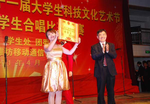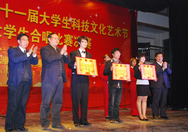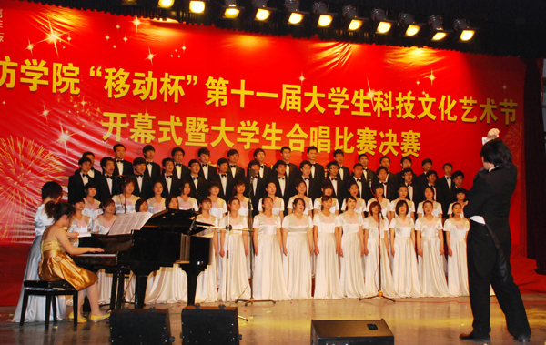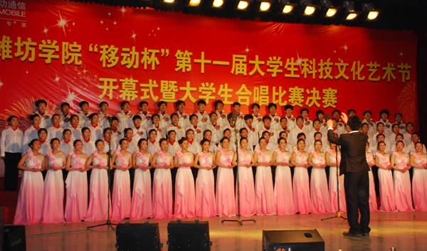 本站訊:4月21日晚,以“旗幟引領,創先爭優,開拓進取,獻禮校慶”為主題的濰坊學院“移動杯”第十一屆大學生科技文化藝術節開幕式暨大學生合唱比賽決賽在聞韶樓排練廳開幕。開幕式以崢嶸歲月、高舉旗幟、夢想啟航三個板塊的合唱比賽為載體,被選拔出的11個二級學院代表隊以誠摯鏗鏘的歌聲為學校的錦繡明天送上了最美好的祝福。