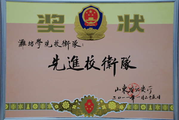 濰坊學院保衛處被山東省公安廳評為“先進校衛隊”,濰坊學院被濰坊市公安局評為高校安全保衛工作先進集體;胡勝軍被山東省公安廳記二等功,王進被山東省公安廳評為優秀護衛隊員,陳明柱被濰坊市公安局評為高校安全保衛工作先進個人。