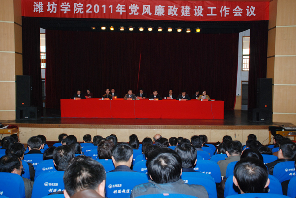 本站訊:3月18日,學校在聞韶樓報告廳召開2011年黨風廉政建設工作會議。黨委書記辛丕宏、院長王守倫代表學校黨委、行政與部分中層部門黨政負責人簽訂了《濰坊學院2011年度黨風廉政建設責任書》,辛丕宏在講話中指出,加強黨風廉政建設,堅持黨的領導是根本的政治保證。全校上下各級黨組織和全體黨員干部,要堅持黨要管黨、從嚴治黨的方針,以強烈的政治責任感和高度的事業心,始終把黨風廉政建設和反腐敗工作納入整體工作之中,突出重點,強力推進,一級抓一級,層層抓落實。會議由黨委副書記牛鐘順主持,紀委書記馬茜華傳達上級紀檢監察會議和全市黨務公開會議精神。副院長王清明、丁子信出席會議。