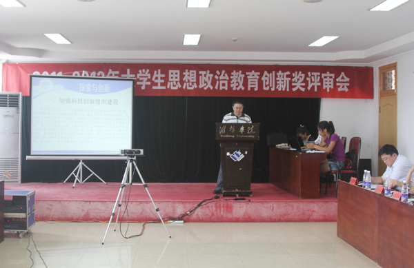 評審會上,來自16個二級學院的參評人員分別以PPT演示形式進行了匯報答辯。計算機工程學院申報的《構建學生學風建設長效機制》、外國語學院申報的《學生會“三自”服務管理模式探索》、建筑工程學院申報的《塑榜樣帶動優秀學風學先進實現美好夢想———“榜樣·建工”優秀大學生評選榜樣教育活動》、美術學院申報的 《在實踐中引領大學生實現德育與美育完美統和》、物理與光電工程學院申報的《“曲金民未來之星”獎學金評選答辯會》、生物與農業工程學院申報的《深造促學風,創新展宏圖》等創新項目。