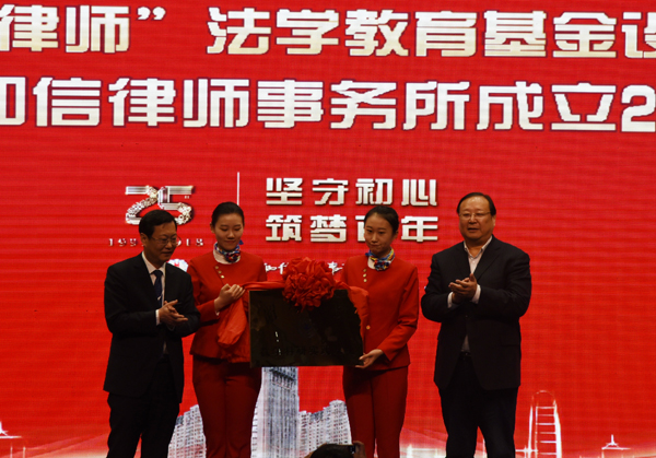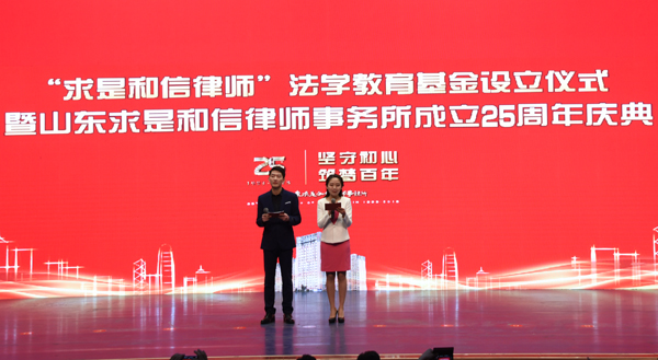 本網訊 4月14日,“求是和信律師”法學教育基金設立儀式暨山東求是和信律師事務所成立25周年慶典在濰坊學院圖書館報告廳舉行。濰坊市人大常委會副主任、法制委員會主任委員范福生,學校校長馮濱魯,黨委副書記王清明出席會議。山東省、各地市律師協會的領導,律師代表,我校法學院師生代表參加了活動。