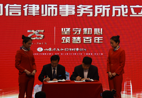 儀式上,馮濱魯與山東求是和信律師事務所主任馬東寧一起為濰坊學院教學科研實踐基地揭牌。王清明與山東求是和信律師事務所主任馬東寧正式簽訂戰略合作協議并捐贈法學教育基金,為經過個人申請、民主評議、個人答辯、律所學院聯席會議研究等環節產生的助學金、獎學金和獎教金獲得者共計34名頒發獎金。同時,求是和信律師事務所為工作20年以上的專職律師、兼職律師以及員工頒發“堅守獎”。