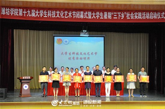 6月26日,濰坊學院第十九屆大學生科技文化藝術節閉幕式暨大學生暑期“三下鄉”社會實踐啟動儀式在濰坊學院聞韶樓報告廳舉行。濰坊學院黨委副書記王清明出席儀式。濰坊學院辦公室、宣傳部、學生工作處、科研處、工會負責同志在主席臺就坐,儀式由團委負責同志主持。濰坊學院各二級學院分管學生工作負責人、團總支書記(副書記)、受表彰人員、社會實踐志愿者代表參加儀式。