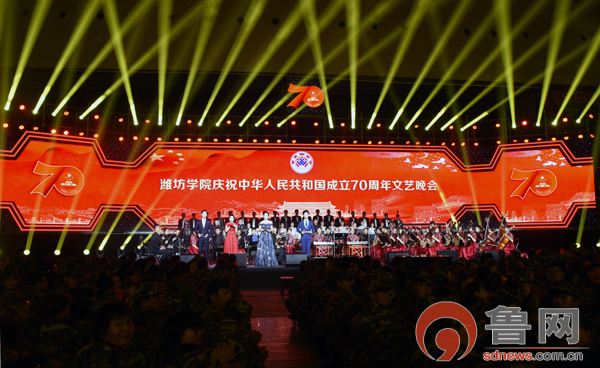 魯網9月30日訊 9月27日晚,在慶祝新中國成立70周年,開展“不忘初心、牢記使命”主題教育之際,濰坊學院慶祝新中國成立70周年文藝晚會在學校體育館舉行。濰坊學院領導孫文亮、馮濱魯、王清明、丁子信、馬茜華、朱猷武、趙光強、王旭升,市委教育工委副書記、市教育局二級調研員李廣敬與6000余名師生及軍訓團官兵一起觀看晚會,共同回顧70年來新中國的建設成就,祝愿偉大的祖國繁榮昌盛。