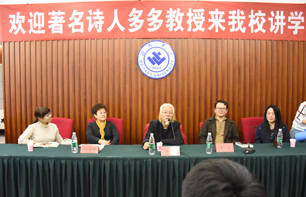 講座上,多多圍繞“詩歌的創造力”這一主題,以自身創作經歷為基點,從詩歌的本質、韻律以及未來的發展方向三個方面展開詳細講述。在具體講解詩歌的創造力時,多多說,詩歌就是帶給人們以自由的東西,詩就是語言,它既不還原現實,又不能流于幻想。由詩歌是“破碎的靈感”一句引到建議同學們在詩歌創作中將理性與感性相結合,使感性的詩歌有內在的邏輯體系。講座中,多多引經據典,嚴肅的講學過程中又不乏幽默,與會人員表示獲益匪淺。