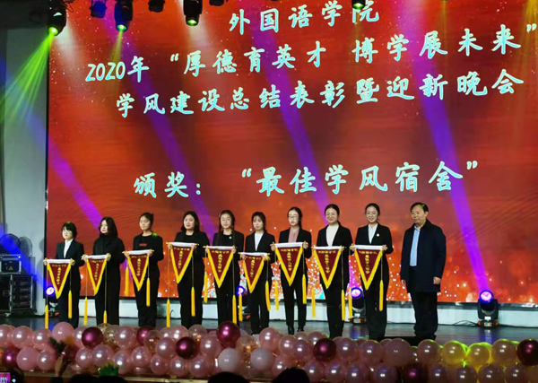 本網訊 為更好傳承優良學風,表彰典型榜樣,展望美好未來,12月14日晚,外國語學院在圖書館報告廳舉辦了以“厚德育英才,博學展未來”為主題的學風建設總結表彰暨迎新晚會。本次晚會共分《立榜樣,明新志》《倡學風,善品行》《新征程,展未來》三個篇章。外國語學院班子成員、全體師生和英邁兒童英語校長于國峰先生出席了本次晚會。