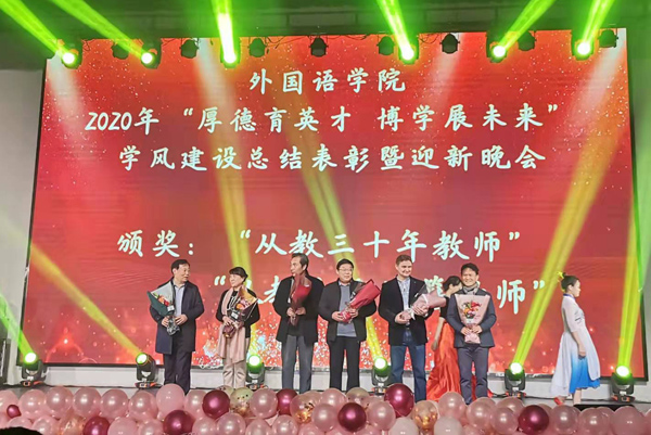 外國語學院院長韓澤亭教授在致辭中肯定了外國語學院的黨建、教學、科研、學生管理等工作所取得的成績,并對全體師生提出殷切期望和中肯要求。外院師生同臺獻藝,以表彰先進,樹立典型為線索,對從教30周年教師、優秀指導老師、最美學霸、最佳學風宿舍和英邁獎學金獲得者進行了表彰。英邁獎學金發起人,外國語學院優秀校友于海云女士通過視頻表達了對母校的感恩,對外院莘莘學子進行了充分肯定,表達了美好的祝愿。中外教師的聯袂演出既彰顯了外院文化的多元性,又凸顯了中華優秀傳統文化的獨特魅力。整場晚會中西合璧,歡快和諧,古風今韻,異彩紛呈,最后在蕩氣回腸的詩朗誦《感受中國》中走向高潮。