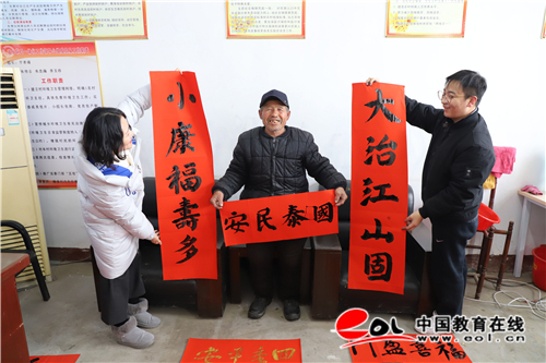 鄉親們拿到寫滿祝福的春聯,一邊欣賞,一邊贊嘆。“快過春節了,我選了一副‘小康福壽多,大治江山固’的春聯,祝愿家人也祝福祖國。”朱樓村八十高齡的朱傳友大爺說。辛莊村支書李堂群說“濰坊學院美術學院的老師同學們給村民們送來了溫暖、送來了祝福、送來了文化、同時更是送來了一份濃濃的愛。”“盈盈的年味,濃濃的關懷。此次活動讓我深切體驗到了文化傳承的意義所在,體會到了政府對老百姓時刻放到心上的溫暖,堅信在中國共產黨的正確領導下,全國人民的共同努力下,不忘初心,砥礪前行,一定能夠掀開小康生活的新篇章。我也會以實際行動參與其中,期待長風破浪會有時,直掛云帆濟滄海的那一刻。”學生黨員劉顏邊寫邊說。