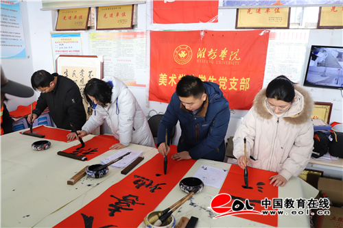 中國教育在線訊 農歷庚子年來臨之際,伴隨著冬雪,沐浴著冬韻,1月7日至9日,濰坊學院美術學院學生黨支部組織師生黨員一行9人赴聊城市茌平區對接學校駐村第一書記,開展“翰墨清風書寫鄉村振興 守正初心助力全面小康”主題活動,寫春聯迎新春,送文化助脫貧。