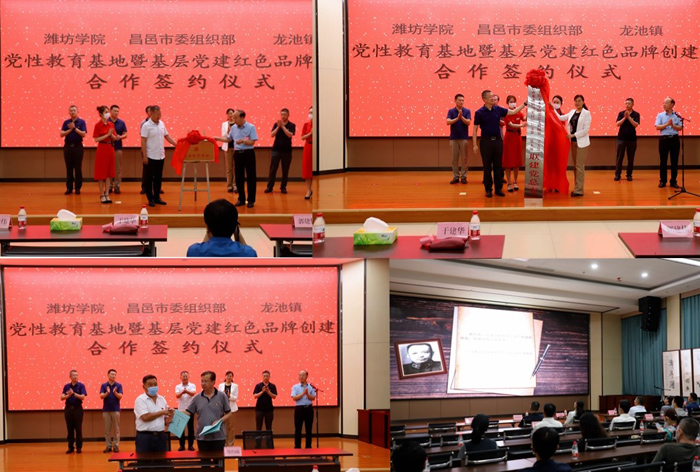 在渤海走廊革命斗爭陳列館報告廳,組織部正處級組織員郭建偉與昌邑市委組織部副部長孫建設共同為“濰坊學院黨性教育基地”揭牌,美術學院黨總支書記于建華與昌邑市龍池鎮黨委副書記王冰共同為“濰坊學院美術學院黨總支教師第一黨支部、昌邑市龍池鎮馬渠村第一黨支部聯建黨總支”揭牌,美術學院黨總支副書記、院長周曉光與龍池鎮馬渠村黨總支書記魏廣政簽訂了《基層黨建紅色品牌培育創建合作框架協議》,全體黨員一起觀看了渤海走廊革命斗爭陳列館建設紀錄片和黨性教育片《發射將軍——李福澤》。