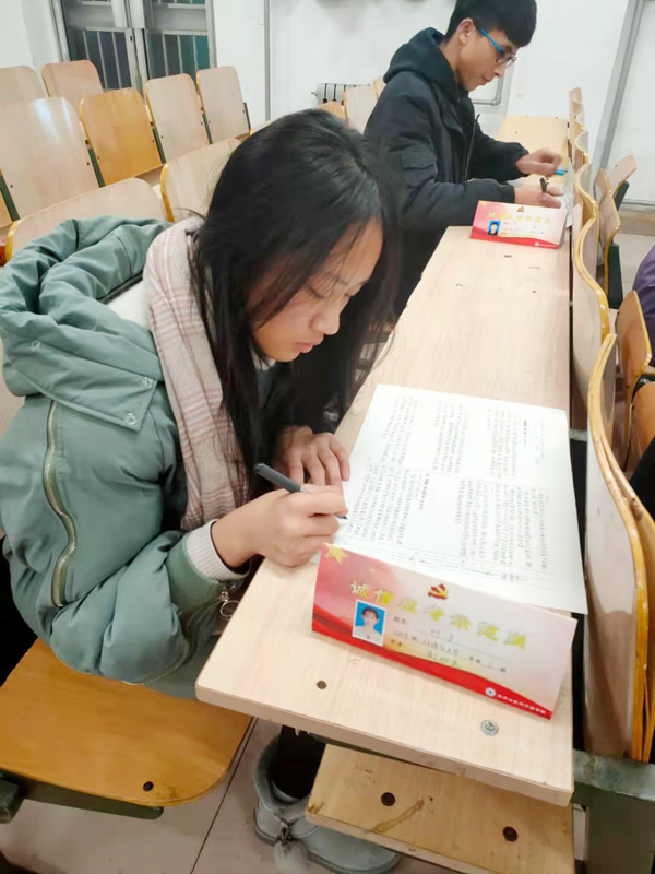 該院還充分發揮黨員和學生干部的引領作用,設置“誠信應考”示范崗,要求黨員和學生干部骨干,時刻嚴格要求自己,規范自己的行為,帶動周圍的同學積極備考,誠信應考。