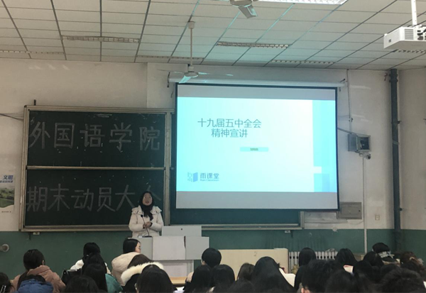 本網訊 1月4日上午,外國語學院黨總支副書記劉希美以“強化就業優先政策,促進高質量就業”為題, 為學院2017級全體同學作黨的十九屆五中全會精神宣講報告。