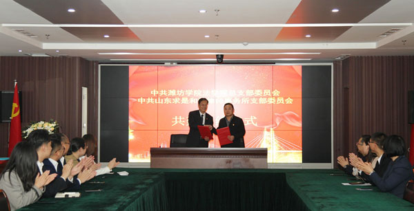 本網訊 為認真落實新時代黨的建設的總要求,進一步加強基層黨組織建設,推動共建單位黨建互聯互動,法學院黨總支與山東求是和信律師事務所黨支部達成合作共建協議。4月9日下午,簽約儀式在求是大廈舉行。法學院黨總支副書記曹興波與山東求是和信律師事務所黨支部書記馬東寧簽約。