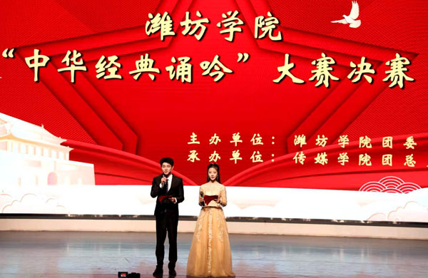 本次大賽共收到各二級學院120多個朗誦作品,經過初賽層層選拔,最終有20個作品進入決賽。參賽選手們以不同形式誦讀紅色經典,或慷慨激昂、或柔和婉轉、或豪邁奔放、或鏗鏘有力,一首首飽含激情的詩歌,抒發了參賽選手矢志不渝的紅色情懷,表達了濰院學子對黨的敬仰之情,引起現場觀眾的共鳴,贏得滿堂喝彩。法學院朗誦的《青春中國》,講述了《南京條約》后無數青年人走向革命道路,最終帶領著中國走向輝煌;文學與新聞傳播學院的《紅船,從南湖出發》,帶領觀眾重溫中國共產黨奮進的艱辛歷程和取得的偉大成就;傳媒學院的《誰是最可愛的人》,講述了志愿軍戰士在抗美援朝戰場上身先士卒、為國捐軀的感人事跡,將比賽推向了高潮。