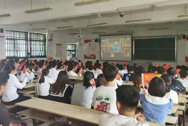 隨著56門禮炮鳴發100響,現場師生全體起立,與慶祝大會現場同步參與了莊嚴的升國旗儀式。在習近平總書記發表重要講話時,大家認真聆聽,并不時地爆發出熱烈的掌聲。