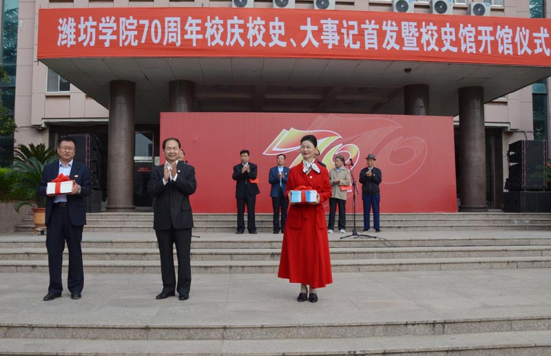 本網訊 10月14日,學校70周年校慶校史、大事記首發暨校史館開館儀式在啟智廣場舉行。學校黨委書記李東、校長馮濱魯出席儀式并為校史館揭牌。黨委副書記王清明、原昌濰師專副校長張克云在儀式上致辭。副校長朱猷武主持儀式。原濰坊職業大學、濰坊廣播電視大學副書記王伯祥,各單位、各部門主要負責人,校史編覽組工作人員,學生代表參加儀式。
