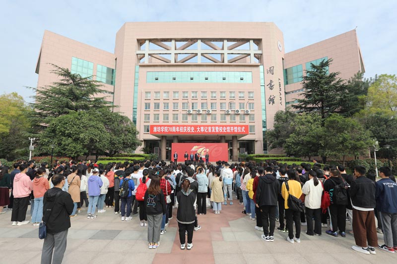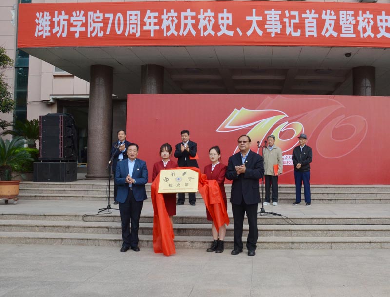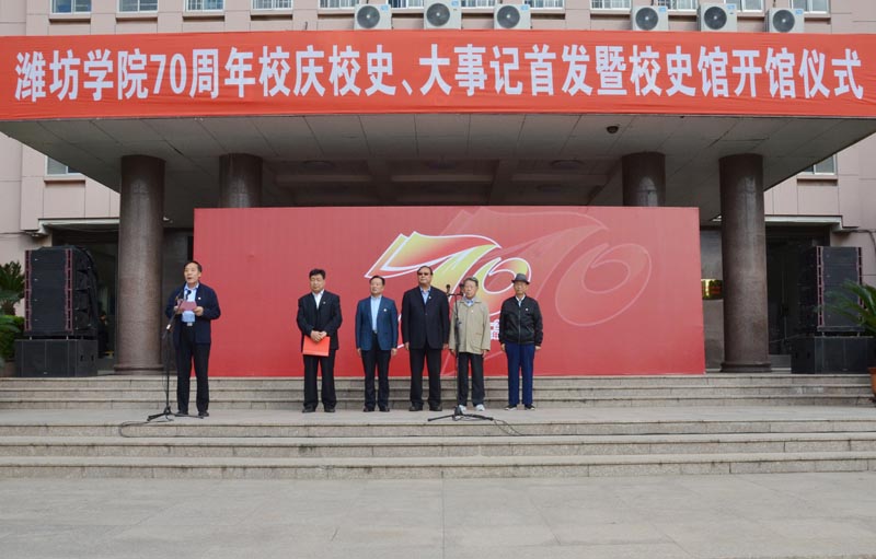 為回顧70年來辦學成就,展示歷代濰院人的光輝業績,進一步傳承濰院精神、鼓舞奮進新征程的昂揚斗志,學校組織編纂了《濰坊學院校史》(2016-2021)和《濰坊學院大事記》(2016-2021),并對校史館進行了重新改造布展。王清明在致辭時,代表學校向各位老領導、老同志以及廣大師生長期以來為學校建設作出的突出貢獻表示崇高的敬意,向參與校史編覽的老師們、同志們表示誠摯的感謝,向校史、大事記和校史館順利首發、開館表示熱烈的祝賀。
