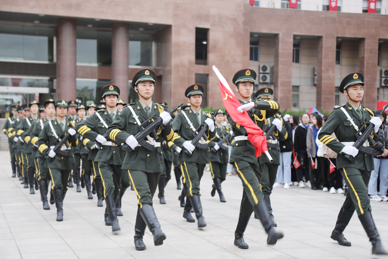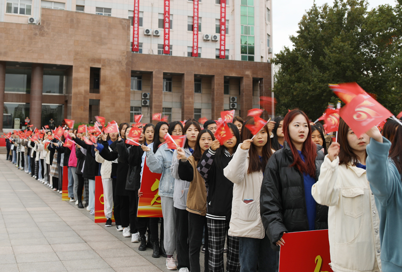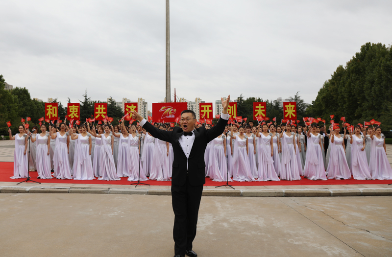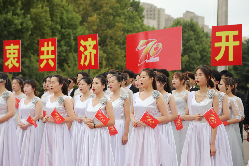 在路途中,我們仍不忘“厚德、博學、求是、創新”的初心,仍弘揚“和衷共濟、艱苦奮斗、追求卓越”的濰院精神,仍向往“開創未來”的盛大景象。這條路注定坎坷,也注定光芒萬丈。帶著堅定的信念,學生代表手執紅旗、肩舉展板與音樂學院合唱團共唱《歌唱祖國》,滿腔熱愛縈繞在廣場上空。