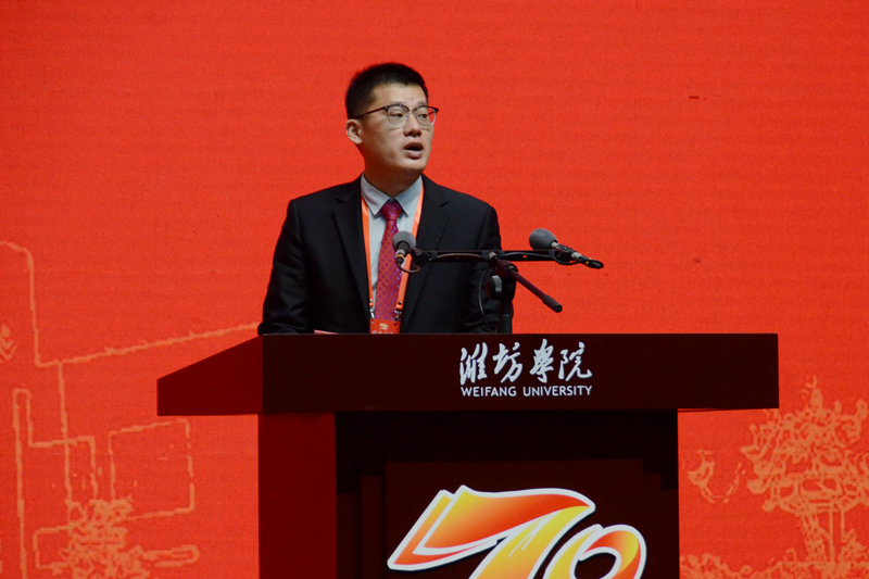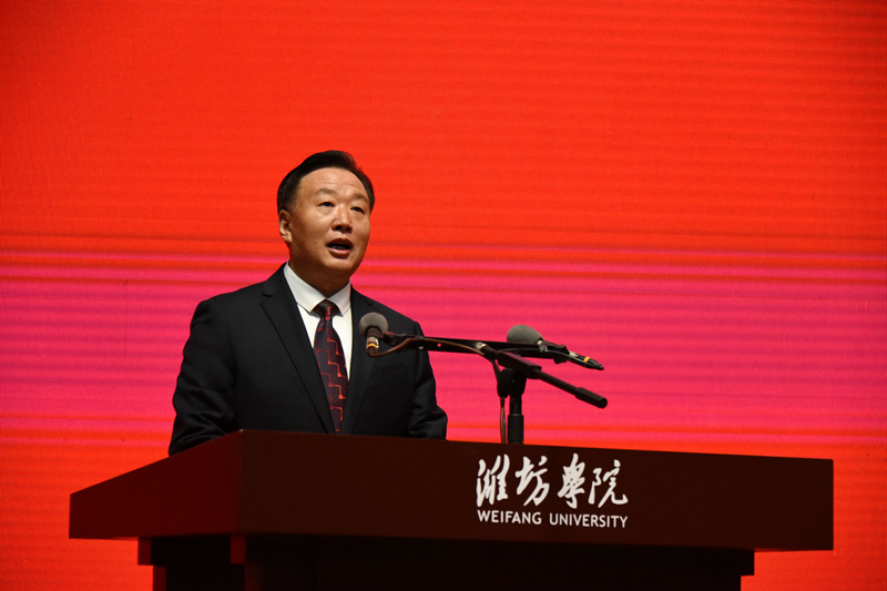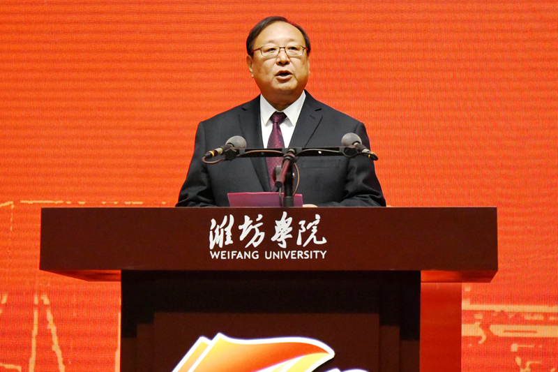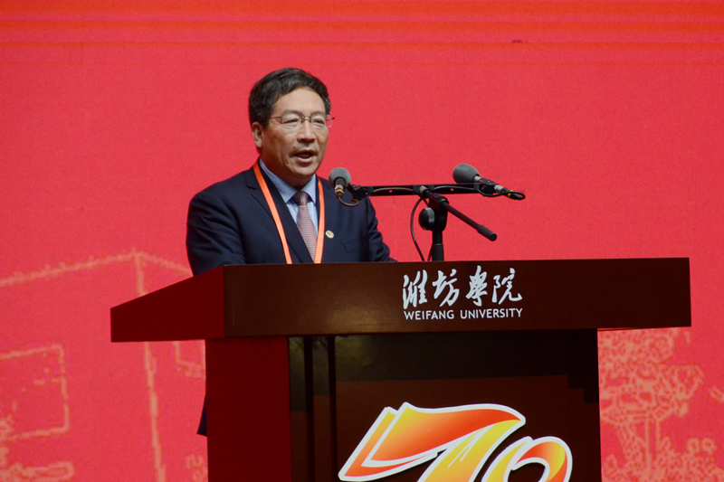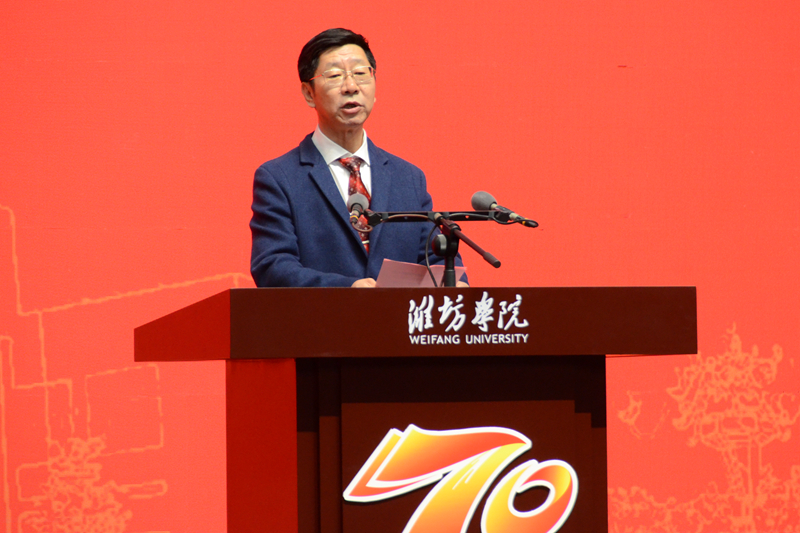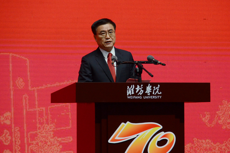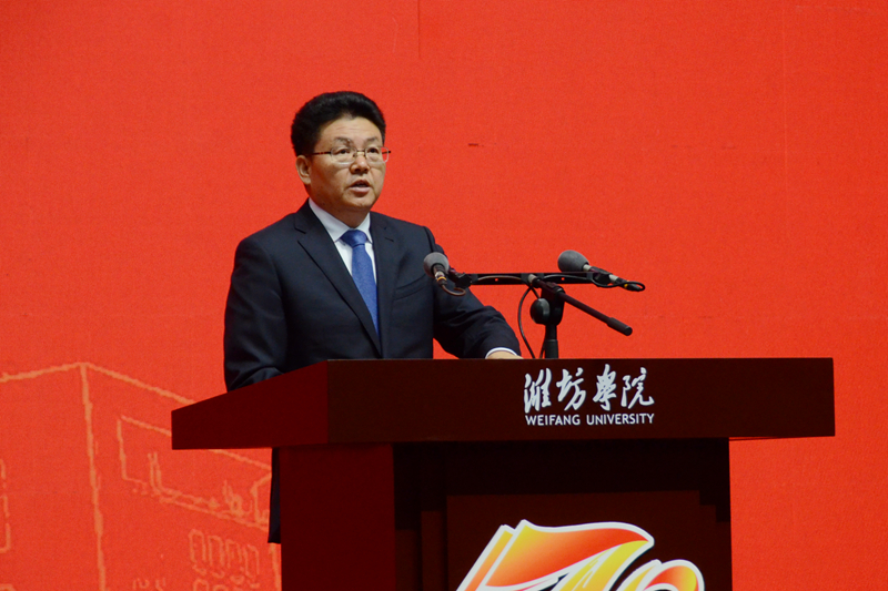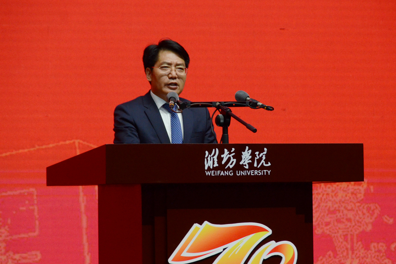 鄧云鋒在致辭中代表中共山東省委教育工委、山東省教育廳祝賀濰坊學院建校70周年。他指出,七十年的風雨兼程,也伴隨著我國高等教育的改革與發展。濰坊學院堅持正確的辦學方向,始終認真貫徹黨的教育方針,辦學規模不斷擴大,辦學條件持續改善,教育質量明顯提高,綜合實力穩步增強,為社會培養了35萬各級各類人才,為推動山東省的經濟社會發展作出了重要的貢獻,贏得了社會的廣泛贊譽。特別是黨的十八大以來,濰坊學院緊緊圍繞落實立德樹人的根本任務,堅持走內涵式發展道路,聚焦工學、經濟學、農學、教育學等學科專業建設,大力推進應用型大學轉型發展,入選了我們山東省應用型本科高校建設首批支持單位和應用型人才培養特色名校立項建設單位,不斷深化校企合作、協同育人,與濰柴集團、歌爾股份等知名企業合作建設現代產業學院,磁懸浮技術、銀鮭魚養殖、水果精準栽培、節能研究等科技成果成功轉化,服務地方經濟社會發展成果豐碩,在省內外的知名度和美譽度在不斷提升。他希望濰坊學院始終堅持以習近平新時代中國特色社會主義思想為指導,深入學習貫徹習近平總書記關于教育的重要論述,堅守為黨育人,為國育才的初心使命,以建校七十周年為一個新的起點,切實加強黨對高校的全面領導,深入落實立德樹人根本任務,在深化改革、服務需求、開放合作中實現高質量發展;主動對接國家和我省的重大戰略,立足學校的辦學定位和學科的發展規律,優化學科的專業結構,實現產學研的深度融合,提高教育教學的質量,打造一流的本科教育,努力培養更多擔當民族復興大任的時代新人。希望廣大教師要認真落實習近平總書記的殷切囑托,擔當育人使命,厚植教育情懷,潛心教書育人,不斷提升思想引領、人才培養、科學研究的能力水平,爭做四有好老師;廣大同學要秉承“厚德、博學、求是、創新”的校訓,樹立遠大理想,傳承紅色基因,珍惜青春年華,勤奮學習,刻苦鉆研,心懷愛國情,篤定報國志,付諸強國行。鄧云鋒表示,省委教育工委和省教育廳,將和濰坊市委、市政府一起來推動省市共建濰坊學院的工作,引導學校進一步聚焦濰坊重點產業發展需求,做好學科和專業的布局,做強優勢特色,不斷提升學校的辦學水平和人才培養質量,加快高水平應用型大學的建設步伐。