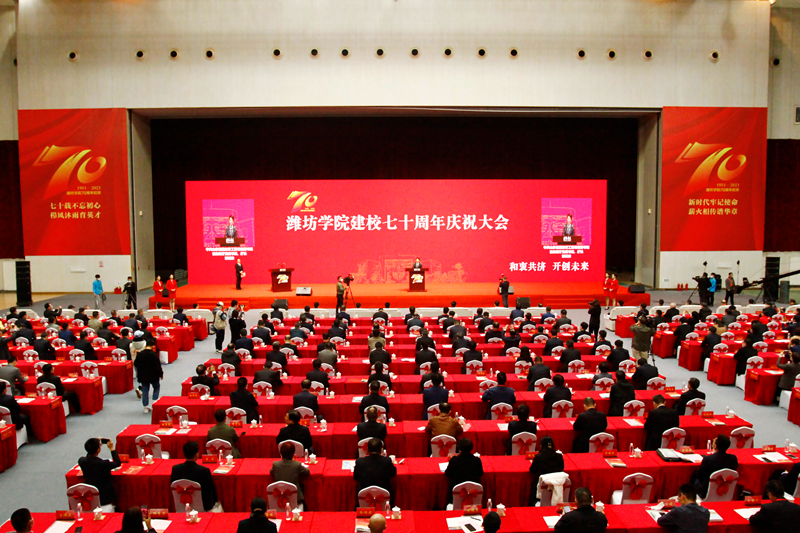 10月16日,濰坊學院校園內彩旗飛揚,祝福的標語格外醒目。此時的主校區體育館內喜氣洋洋,歡樂祥和。主席臺正中背景上顯示著“濰坊學院建校七十周年慶祝大會”的字幕和“和衷共濟、開創未來”校慶主題,兩側大幅紅色海報上“七十載不忘初心、櫛風沐雨育英才”“新時代牢記使命、薪火相傳譜華章”的標語彰顯著七十年的責任、使命和擔當。