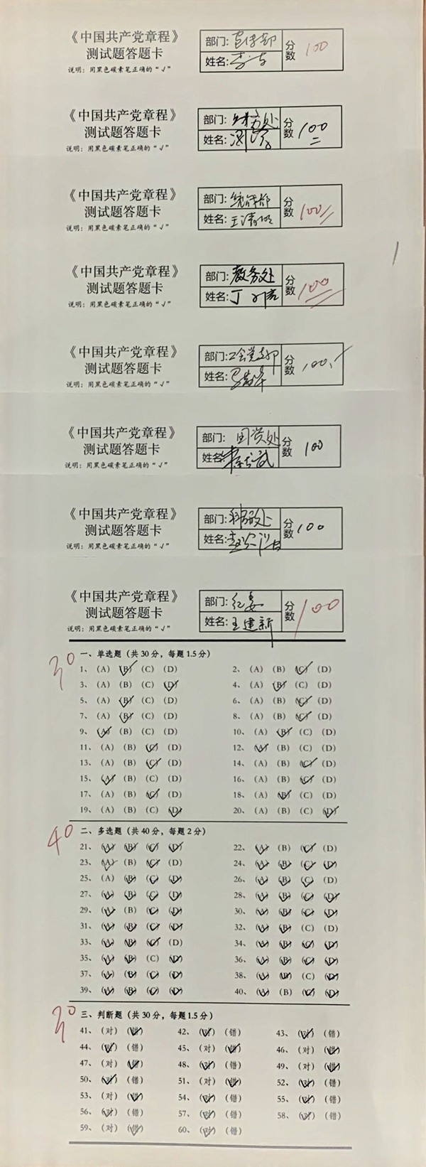 截止到10月28日,購買發放178冊黨章,各黨支部組織全體黨員進行了學習。測試由機關黨委統一命題,共印發答題卡178份。178名黨員全部參加了測試,學校領導分別在所在黨支部以普通黨員身份參加。