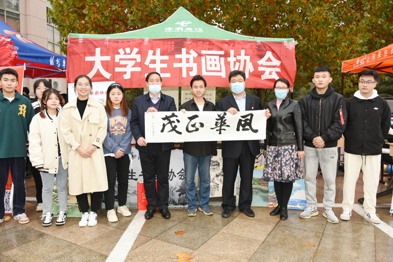 納新現場,各社團結合自身特點,“爭奇斗艷”,紛紛進行了現場表演和優秀作品展示,用最特別的方式吸引新社員的加入。大學生攝影協會用優秀的攝影作品,吸引同學們駐足觀賞。大學生科技創新協會的獲獎作品和獲獎證書、大學生魔方社用舞動的手指展示的六色變換、大學生街舞協會的動感舞姿、花藝手工環保協會的精美手工等,都吸引著同學們躍躍欲試、積極互動。大學生書畫協會現場進行書畫展示,盡情揮灑著筆墨,會員劉彥龍同學的現場書法作品“風華正茂”,受到了王清明書記的贊揚。