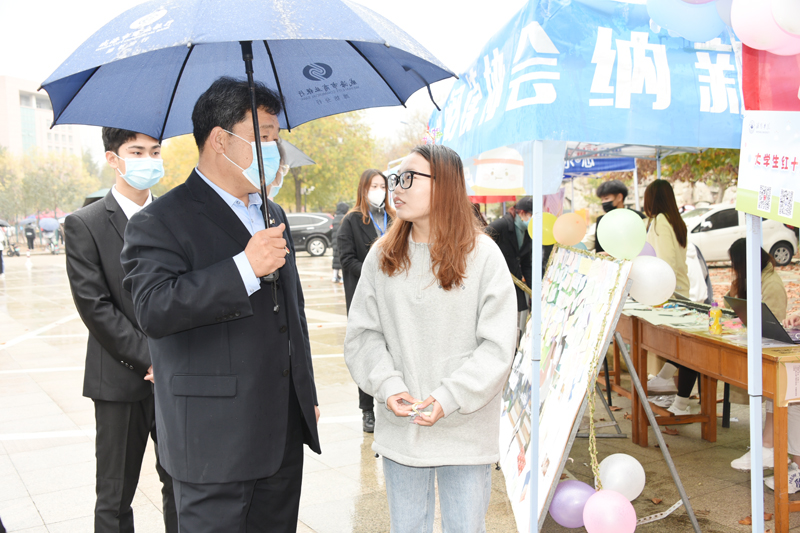 活動現場,王清明與每一位社團負責人深入交流,詢問社團開展的日常活動和納新情況,并結合不同類型的社團給出指導性的建議。同時表達了對同學們在納新過程中要時刻注意疫情防護安全。在交流過程中,王清明指出,學生社團要在學校黨委的領導和團委的具體指導下,規范健康發展,堅持以初心打造社團特色活動,用創新拓展社團舞臺,為全校同學提供更加豐富多彩的社團文化活動。