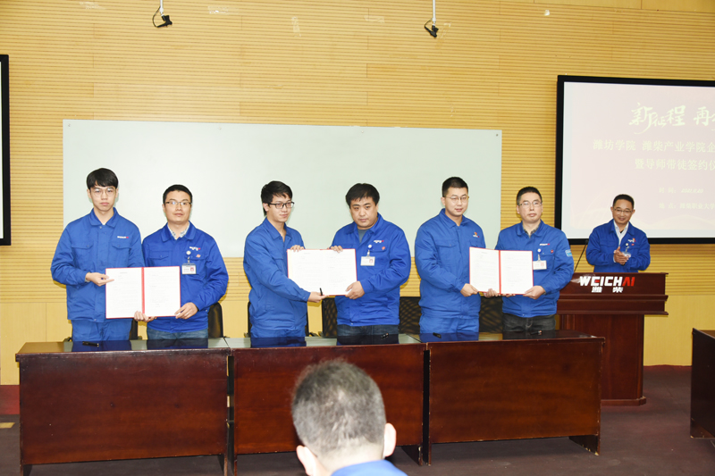 會上,丁子信、劉永勝為新聘產業導師頒發聘書。產業導師代表與學生代表簽訂導師帶徒協議。會議還播放了2018級學生在濰柴集團理實一體階段性學習總結視頻。