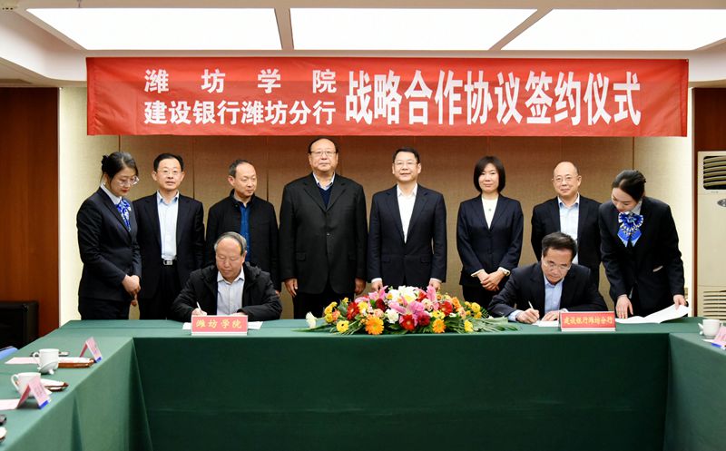 本網訊 11月25日,學校與建設銀行濰坊分行戰略合作協議簽約儀式在建設銀行濰坊分行會議室舉行。校黨委副書記、校長馮濱魯,建設銀行濰坊分行行長張健及有關人員出席簽約儀式。