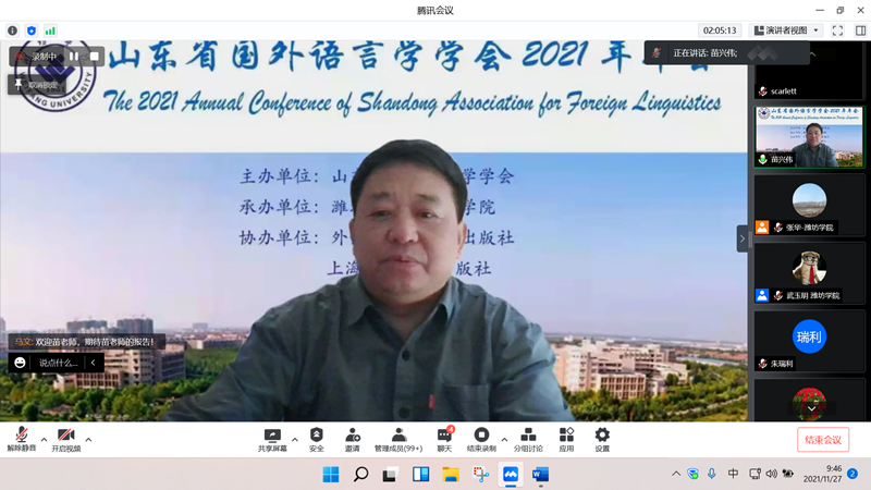 本網訊 11月27日至28日,山東省國外語言學學會2021年年會在我校舉行。本屆年會由山東省國外語言學會主辦,濰坊學院外國語學院承辦,來自省內外60多所高校的300余名代表參加了此次線上年會。副校長趙光強出席開幕式并致辭,山東省國外語言學學會會長王俊菊代表學會致辭,開幕式由外國語學院院長韓澤亭主持。