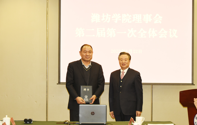 會議根據《濰坊學院章程》和《濰坊學院理事會章程》選舉產生了新一屆理事會成員。李東當選為理事長,馮濱魯當選為常務副理事長,張華當選為秘書長。濰坊鑫源金店有限公司董事長曲金民,中國科學院院士劉以訓,山東景芝酒業股份有限公司董事長劉全平,濰坊市委教育工委常務副書記、市教育局黨組書記、局長杜全平,南開大學教授逄錦聚,歌爾聲學股份有限公司董事長姜濱,濰坊昌大建設集團有限公司董事長徐鵬強,濰柴集團工會主席魯文武當選為副理事長。原濰坊市政府顧問、濰坊學院原黨委書記辛丕宏同志,濰坊理工學院黨委書記、濰坊學院原黨委書記孫文亮同志當選為名譽理事長。新當選的理事長李東為新當選的副理事長頒發了聘書。