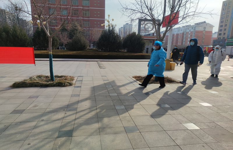 學生入校結束,1名消殺人員(著B套裝)對大門入校通道、臨時留觀點進行通風消毒。