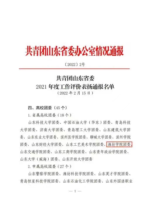 本網訊 近日,團省委下發《共青團山東省委2021年度工作評價表揚通報名單》(〔2022〕2號),校團委在全省共青團工作考核中獲評“優秀”等次。