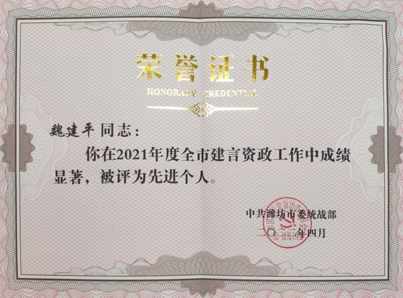 本網訊 2022年4月,濰坊市委統戰部表彰了2021年度全市統戰信息宣傳工作先進單位和先進個人。我校經濟管理學院魏建平教授被評為全市建言資政工作先進個人,這是他連續三年獲得此項殊榮。