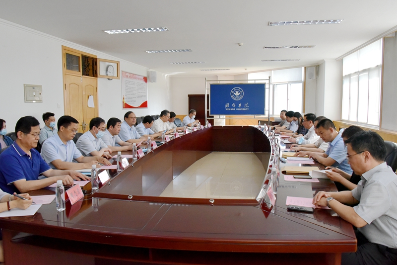 本網訊 6月1日,山東省外辦副主任林海濱一行來校調研指導濰坊RCEP研究中心智庫建設工作,省外辦宣調處處長曹春,美大處四級調研員林楠,宣調處四級調研員劉純峰,綜合處一級主任科員石正民、宣調處房蕊,濰坊市政府黨組成員、副市長狄波,市政府副秘書長曹立忠,市外辦黨組書記、主任葛英煜,副主任宋悅林、宋玉民及工作人員陪同調研。我校黨委副書記、校長馮濱魯,黨委委員、副校長趙光強熱情接待了客人并在會議室進行座談。