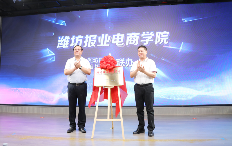 儀式上,馮濱魯與濰坊日報社(濰坊報業集團)黨委書記、社長、董事長張仁科為濰坊報業電商學院揭牌。