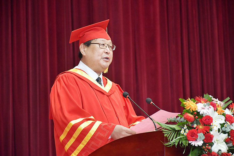 馮濱魯在致辭中向圓滿完成學業的6619名畢業生表示熱烈的祝賀,向為同學們的成長成才傾注心血和汗水的老師、家長,表示感謝。他勉勵畢業生開拓進取、奮勇爭先,在廣闊的舞臺上施展才干,朝著光明的前景奮力奔跑,跑好新時代賦予的這一棒接力賽。馮濱魯贈言畢業生,要做志向高遠的追夢人,心懷家國、信念堅定。要樹立遠大理想目標,涵養家國情懷,與時代同頻共振,將個人的“小目標”融入黨和國家的“大藍圖”,心系“國家事”、肩扛“國家責”、厚植“國家情”,用行動踐行“請黨放心,強國有我”的錚錚誓言;要做終身成長的實踐者,日日精進、無有不成。要樂于學習、善于學習、終身學習;要做勇攀高峰的實干家,腳踏實地、篤行致遠。要有一種豁達和奮進的姿態,經受磨難、不畏挫折,昂揚唯實惟先的朝氣、挺起踔厲奮發的志氣和攻堅克難的銳氣,內心有光、精神明亮,篤行致遠、不負韶華。