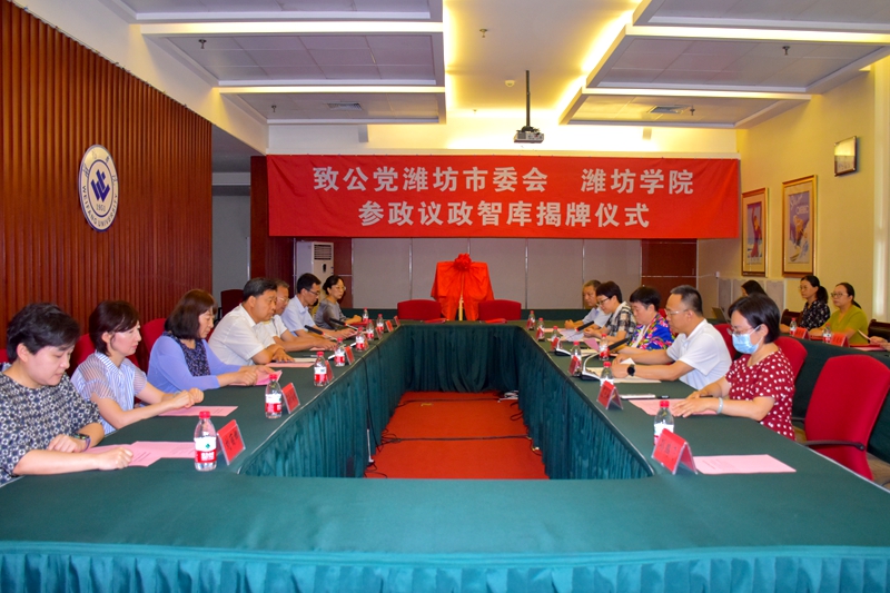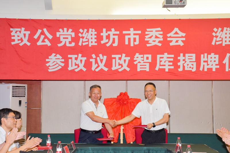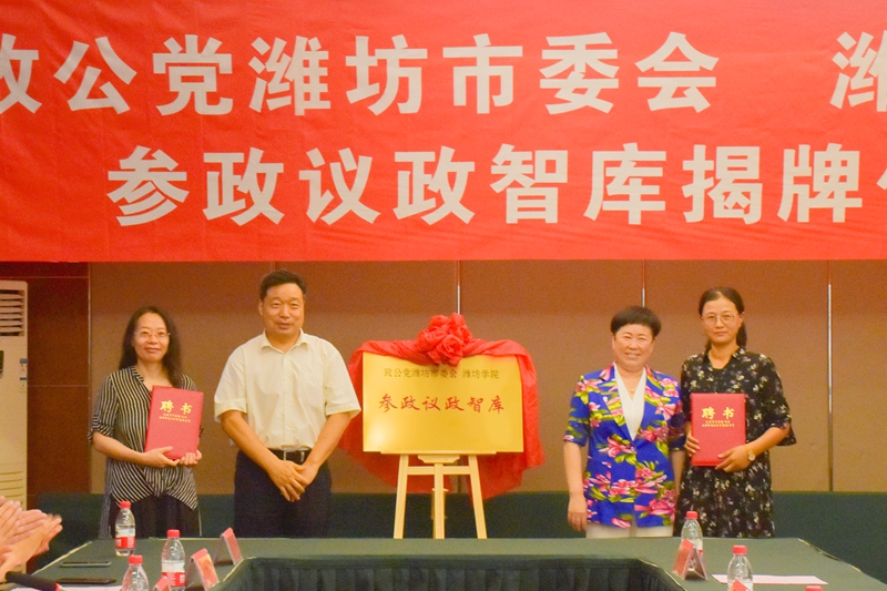 本網訊 6月30日上午,濰坊學院與致公黨濰坊市委會聯合舉行“參政議政智庫”成立儀式。市政協副主席、致公黨濰坊市委會主委任春娥,濰坊學院黨委副書記、統戰部部長王清明共同為智庫揭牌。活動中,雙方簽署共建“參政議政智庫”協議書,為首批聘任的智庫專家頒發了聘書。