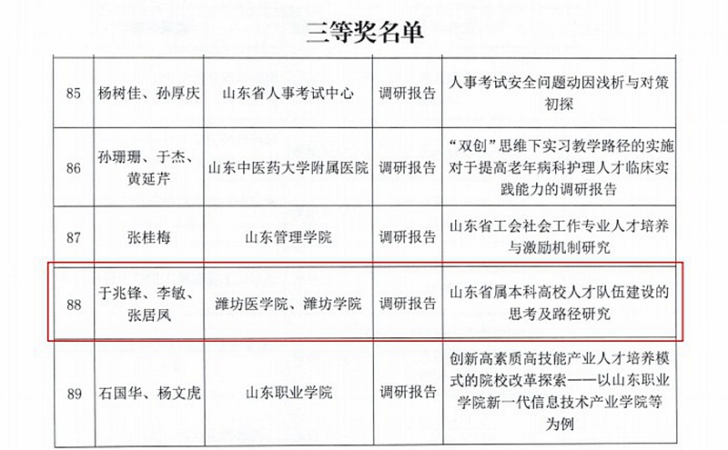 本網訊 近日,第八屆(2021年度)山東省人力資源社會保障優秀科研成果名單公布,由我校魏建平老師為主撰寫的調研報告《關于加快我市新時期高素質產業工人隊伍建設調研報告》榮獲二等獎;由我校李敏老師參與撰寫,聯合濰坊醫學院申報的調研報告《山東省屬本科高校人才隊伍建設的思考及路徑研究》榮獲三等獎。