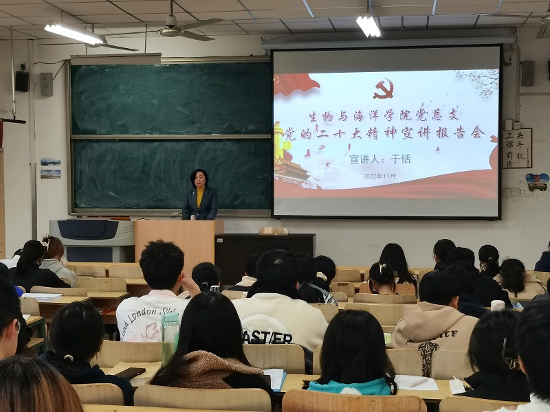 本網訊 11月17日,生物與海洋學院黨總支在8411教室舉行黨的二十大精神宣講報告會,黨總支書記于恬為大一新生宣講黨的二十大精神。