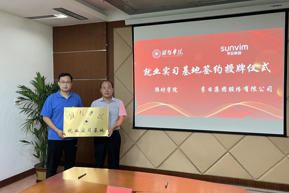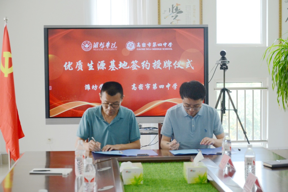 本網訊 6月24日,北海國際學院黨委書記任懷坤、院長王波一行赴高密市第四中學和孚日集團股份有限公司舉行濰坊學院優質生源基地、就業實習基地簽約授牌儀式。