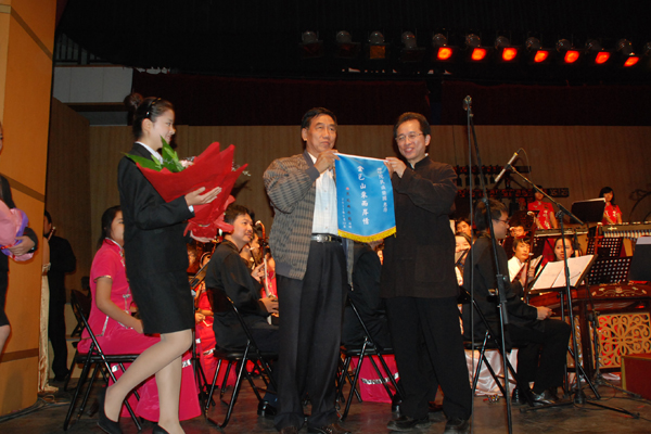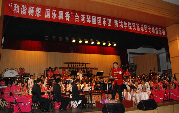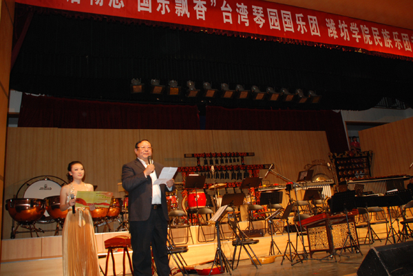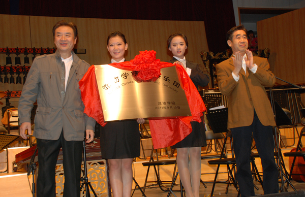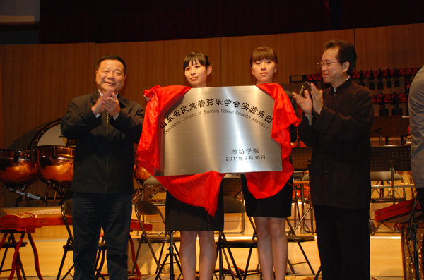 晚會開始前,黨委書記辛丕宏與琴園國樂團團長林谷珍為“山東省民族管弦樂學會實驗樂團”揭牌、黨委副書記牛鐘順與山東歌舞劇院院長曲祥為“濰坊學院民族樂團”揭牌。副院長馮濱魯發表賀詞。晚會中,副院長邢同學代表學校接受了琴園國樂團贈送的象征友好交流的錦旗。