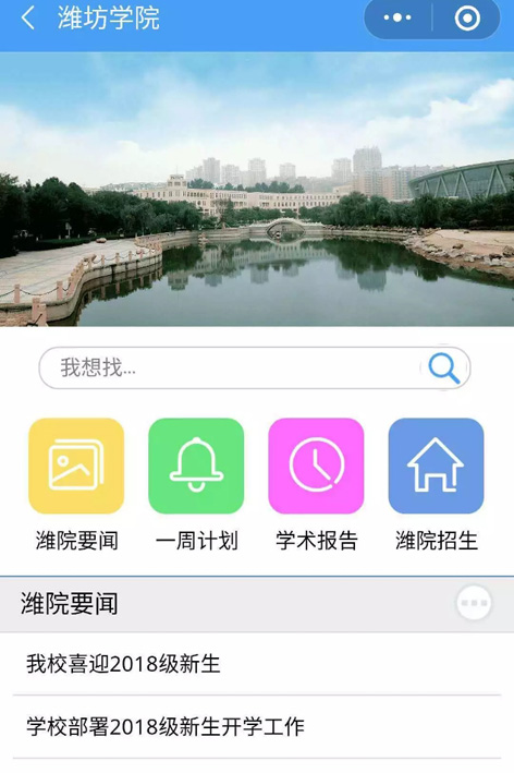 濰坊學院小程序,整合了校園導覽,濰院要聞、一周計劃、學術報告、濰院招生。訪客可以通過小程序快速瀏覽、定位校園景點、院系、教學樓、宿舍、餐飲、圖書館等設施,同時還可通過小程序獲取學校簡介、學校VR實景,查詢周工作計劃及招生信息等。