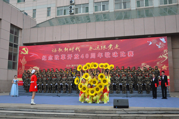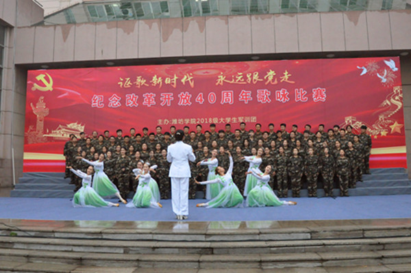 特教幼教師范學院演唱的《前進吧,中國共產黨》拉開了新生軍訓團歌詠比賽的序幕。《復興之路》《永遠跟黨走》《強軍戰歌》《我們走在大路上》《不忘初心》《在希望的田野上》《中國軍魂》等一首首紅歌,各比賽團隊都加入了更多的創意,展現出了不同的風格。一首首耳熟能詳的歌曲,充分展示青年學生愛黨、愛國、愛軍的情懷和蓬勃向上的精神風貌,唱出了濰院學子滿腔的愛國熱情,永遠跟黨走的堅定理想信念。