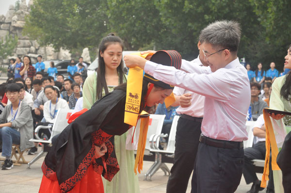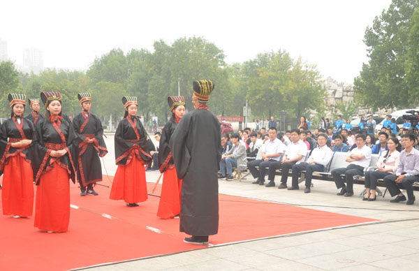 在“三禮”示范教育的展示現場,我校歷史文化與旅游學院的學生為全省參賽選手展示了“開筆禮”“志學禮”“成人禮”儀式。劉少華和孫文亮共同為學子額點朱砂,開蒙啟智;還為學子佩戴“君子”綬帶,寄托美好祝愿。展示現場,還邀請所有參賽選手學習、演示相關禮儀,一同面向先師孔子像莊嚴行禮。我校播音與主持專業的大學生志愿者代表,還集體朗誦了我校優秀青年教師趙瑞軍老師為本屆青春國學薈撰寫的祝文《濰院頌》,學子們用端莊、鏗鏘的深情吟誦,表達出濰院學子弘揚國學、情系濰院、立志成才的青春信念。