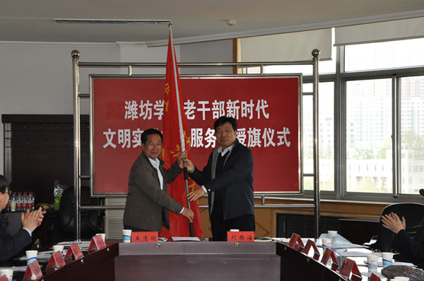 本網訊 4月16日,濰坊首支高校老干部新時代文明實踐志愿服務隊伍——濰坊學院老干部新時代文明實踐志愿服務隊在我校正式成立。這支隊伍是為充分發揮老干部們政治優勢、經驗優勢、威望優勢和作用,多渠道、多方位滿足老干部們的精神需求,引導老干部保持老驥伏櫪、老當益壯的健康心態和進取精神,本著學養相彰、開放融合、老有所為的工作理念,激勵老干部們用自己的特長服務社會、服務濰坊、服務群眾。校黨委副書記王清明出席成立儀式并向志愿服務隊隊長授旗。市委宣傳部二級調研員劉西海出席儀式,離退休處相關負責同志、志愿服務隊成員參加了儀式。