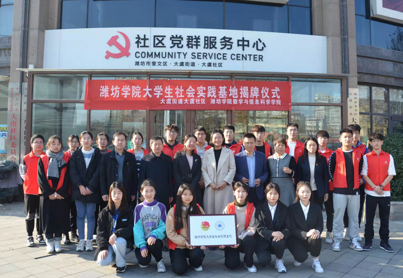 本網訊 為弘揚志愿精神,傳遞公益力量,12月5日上午,由數學與信息科學學院與奎文區大虞街道大虞社區合作的濰坊學院大學生社會實踐基地掛牌儀式在大虞社區舉行。奎文區團委書記卜維瑋、大虞街道黨工委副書記徐佳、數學學院黨總支書記周瑩、黨總支副書記鄭棟鵬等出席揭牌儀式。揭牌儀式由大虞社區黨委書記潘兆霞主持,數學學院“1+1”志愿服務隊志愿者代表參加活動。