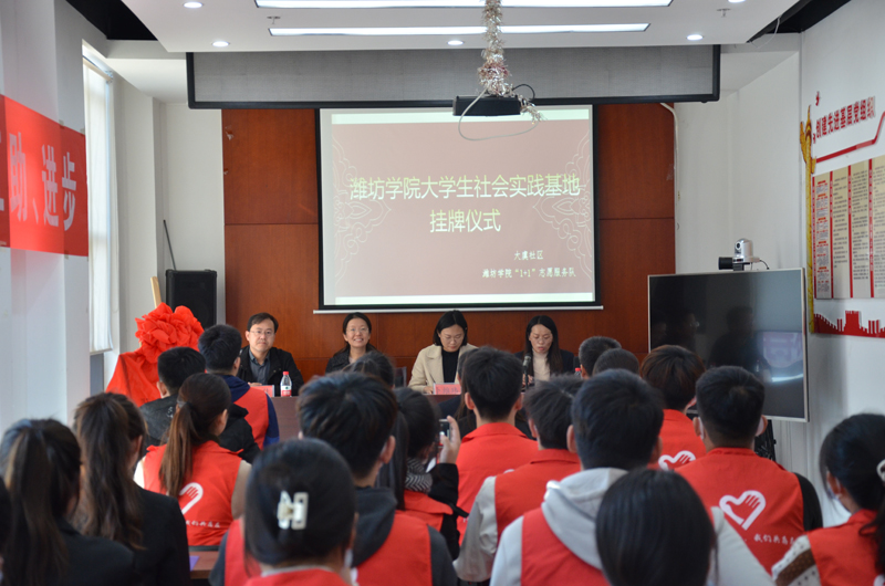 儀式上,卜維瑋、周瑩分別致辭;潘兆霞與學院團總支副書記王鑫莉共同簽訂了《共建濰坊學院大學生社會實踐基地協議書》;徐佳與鄭棟鵬共同為濰坊學院大學生社會實踐基地揭牌;志愿者代表顏家琪同學作發言。