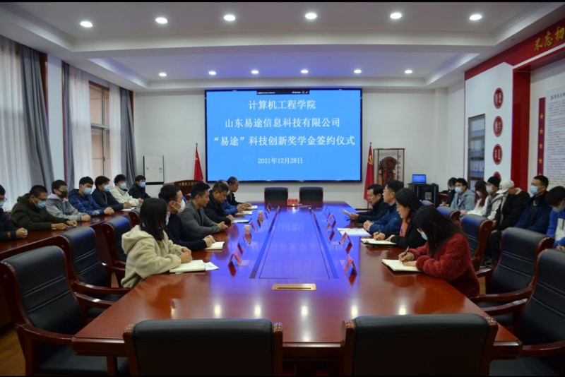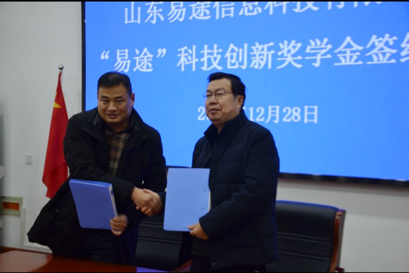 本網訊 12月28日,“易途”科技創新獎學金簽約儀式在計算機工程學院舉行。山東易途信息科技有限公司副總經理時念新與計算機工程學院院長王成端簽署協議。