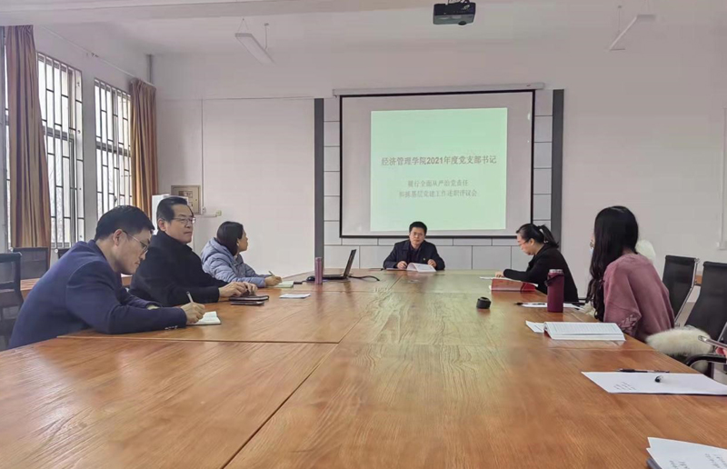 本網訊 1月7日下午,經濟管理學院2021年度黨支部書記履行全面從嚴治黨責任和抓基層黨建工作述職評議會召開。會議由經濟管理學院黨總支副書記、院長劉鵬主持,黨總支副書記王海梅和各黨支部書記參加了會議。
